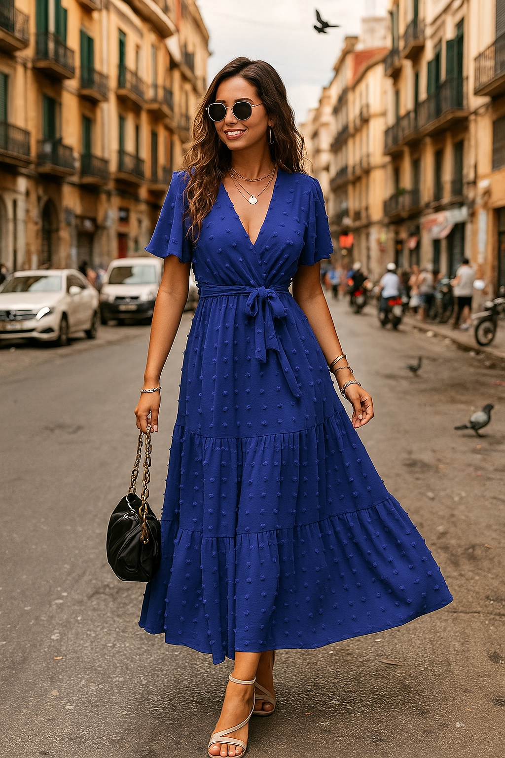 Caractéristiques de cette maxi‑robe : pois suisses • ceinture auto‑serrée • taille élastique • manches courtes à volants • faux cache‑cœur encolure V • étages fluides.