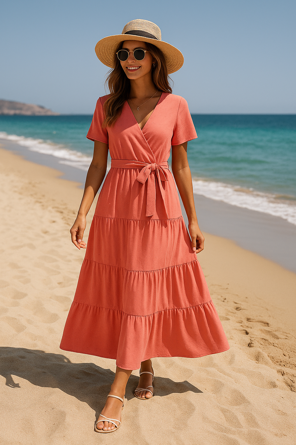 Les robes d’été pour femmes de 2025 sont nos toutes dernières nouveautés : faux cache‑cœur encolure V, manches courtes à volants, ceinture auto‑serrée à la taille, couleur unie, imprimé à pois suisse, longueur cheville et ourlet volanté à étages fluides. La maxi‑robe bohème pour femmes est dotée d’une ceinture à nouer qui accentue élégamment la silhouette et met en valeur votre charme féminin. Son style à la fois tendance et polyvalent en fait la tenue idéale pour les invitées de mariage.